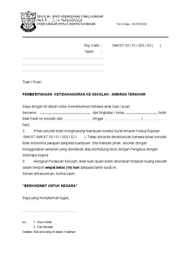 Format surat amaran terakhir untuk ketidakhadiran ke sekolah.