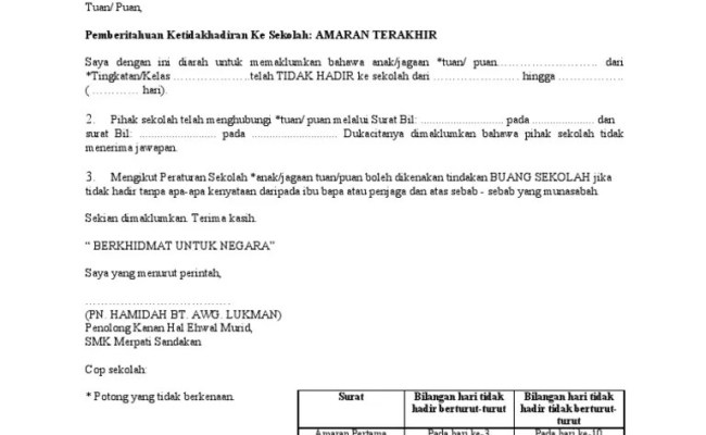 Surat amaran tidak hadir ke sekolah. Ketidakhadiran tuan/puan pada tarikh di atas boleh dikenakan tindakan tatatertib, boleh dilucuthak emolumen bagi hari staf tidak hadir bertugas di bawah . Contoh surat tunjuk sebab tidak hadir kerja sekolah lewat. Contoh surat amaran tidak hadir bekerja menurut rekod anda telah melanggar kod etika kerja yang telah ditetapkan syarikat iaitu. Contoh surat berhenti kerja notis sebulan. Surat amaran kepada penjaga murid. Format surat amaran terakhir untuk ketidakhadiran ke sekolah.